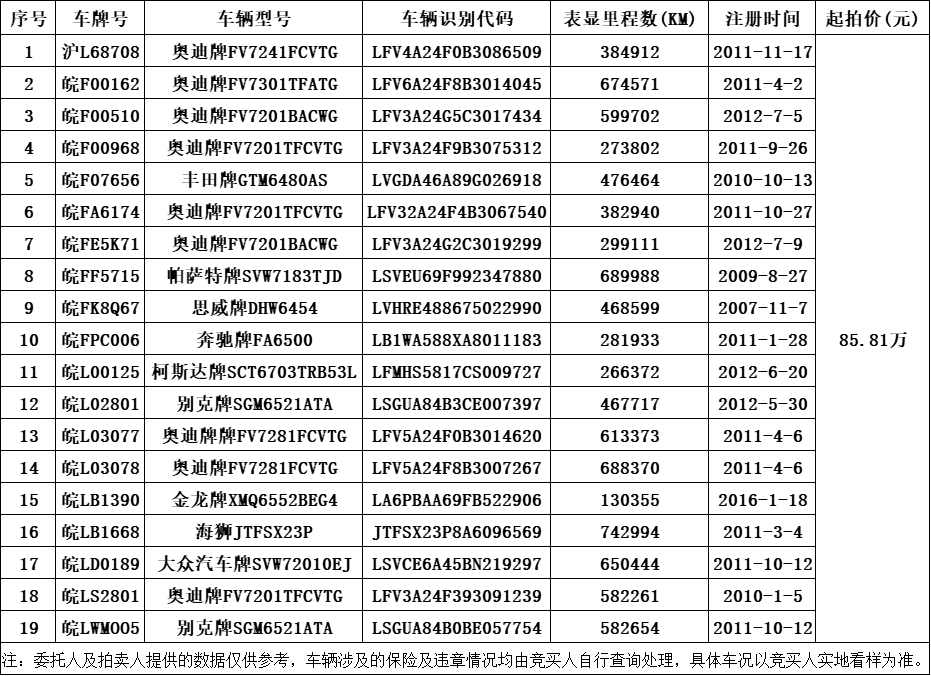 一、拍卖标的:皖北煤电集团有限责任公司所属退服车辆一批(19辆),起拍价85.81万元,保证金25万元,增价幅度1000元/次,按标的现状整体拍卖(不含车牌)。