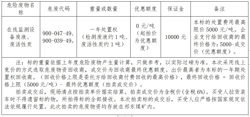 一、拍卖标的:祁东煤矿2024年危废物资(在线监测设备废液、废活性炭)处置权,标的清单如下: