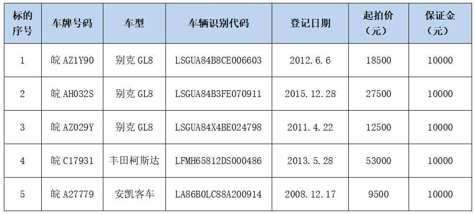 一、拍卖标的:丰田柯斯达、别克商务车等退服车辆一批。加价幅度200元/次,按标的现状拍卖,不含车牌,详见《标的清单》。