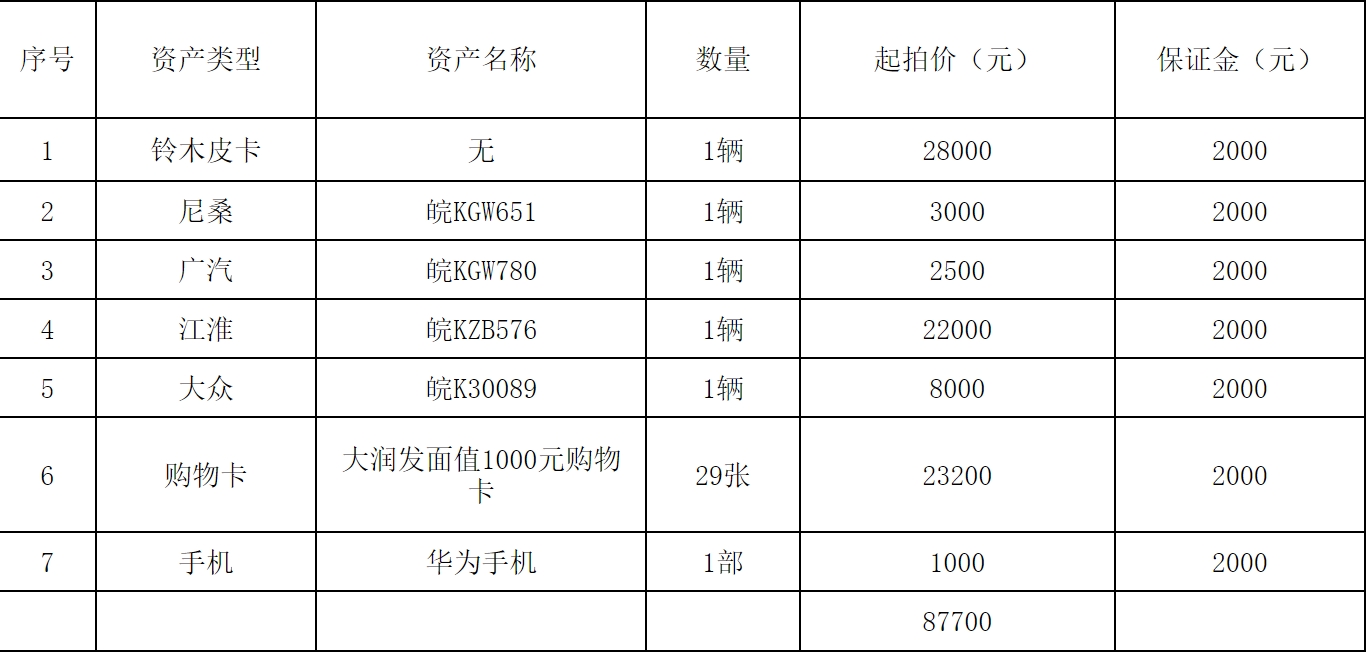 一、拍卖标的:车辆5辆,大润发面值1000元购物卡29张,华为手机一部(详见《拍卖清单》)。