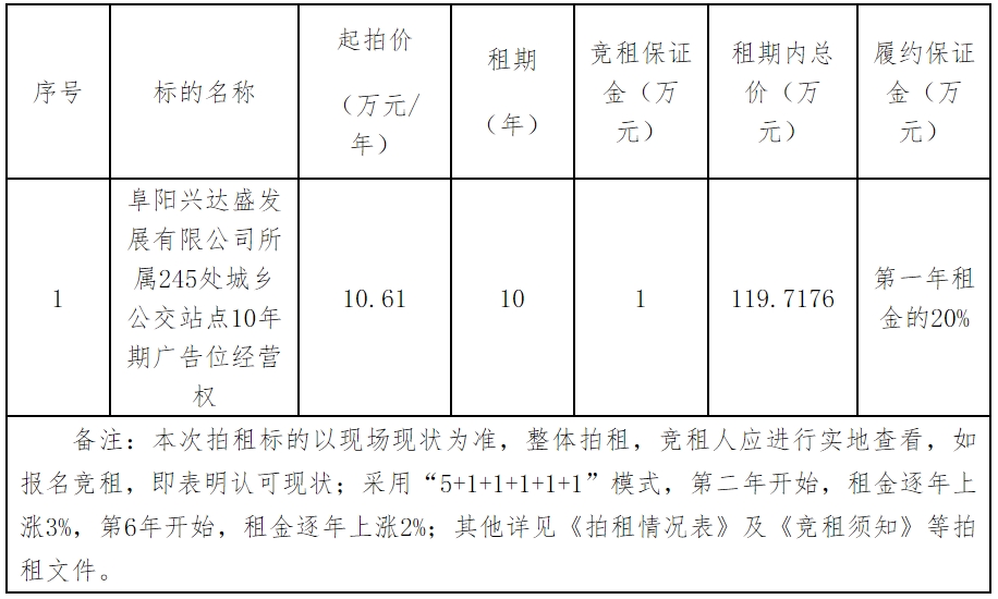 245处城乡公交站点广告位10年期经营权,详见《拍租情况表》: