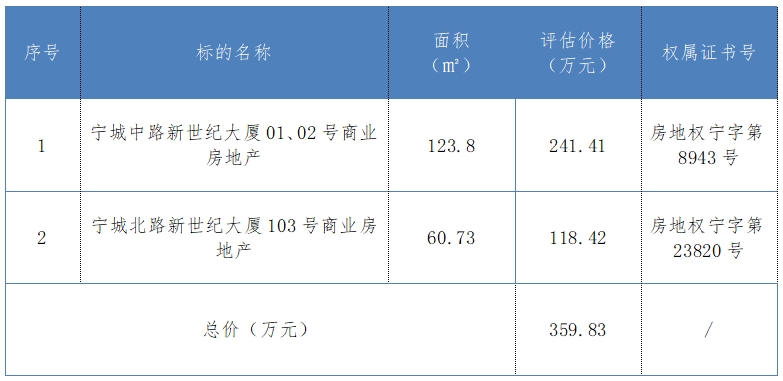 一、拍卖标的:宁国市2处商业房地产(整体拍卖),起拍价359.83万元,增价幅度5000元,保证金110万元,详见《标的清单》。