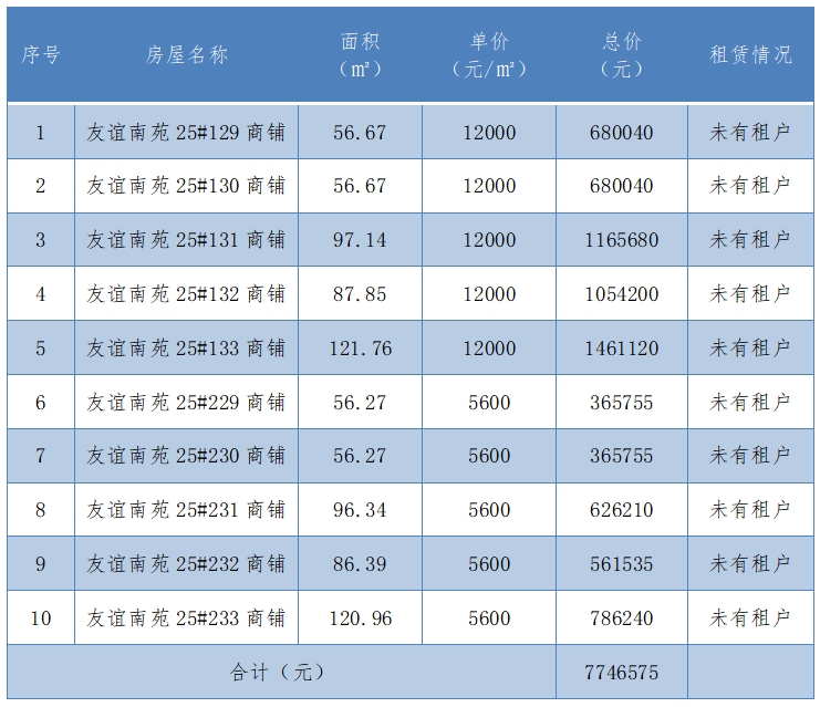 六安市友谊南苑十间商铺(整体拍卖),起拍价774.6575万元,保证金80万元。