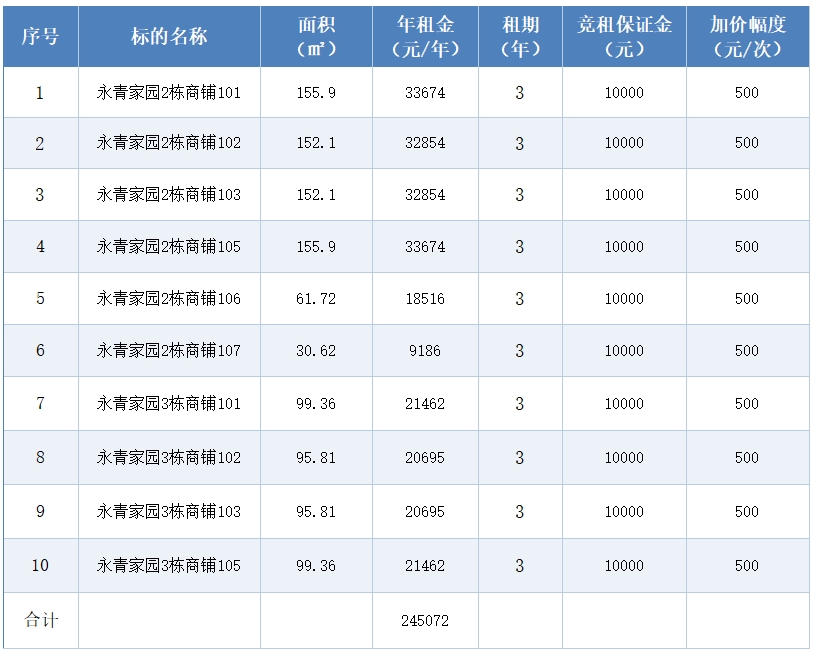 一、拍租标的:合肥市永青家园2栋、3栋等10间门面三年期租赁权,(详见《标的清单》);