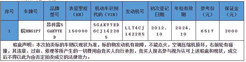 一、拍卖标的:安庆市旧机动车1台(详见《标的清单》;
