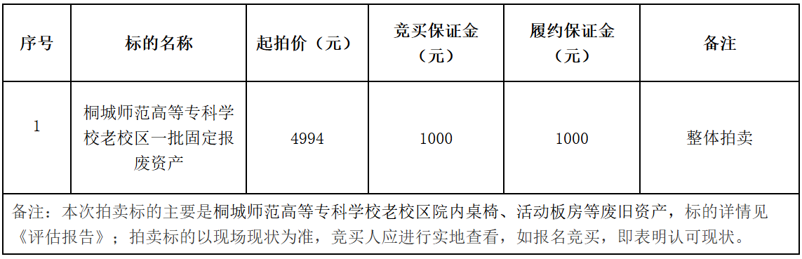 一、拍租标的:桐城师范高等专科学校老校区一批固定报废资产,详见拍卖清单: