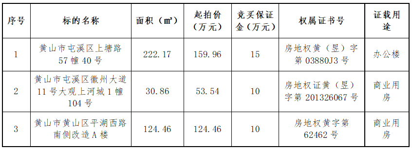 一、拍卖标的:黄山市3处商业及办公房地产,详见《标的清单》。