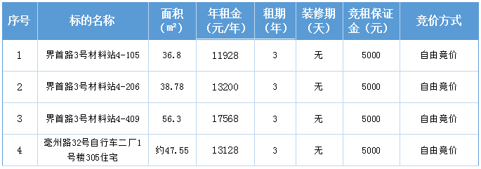 一、拍租标的:庐阳区界首路3号材料站等4间住宅房产三年期租赁权;