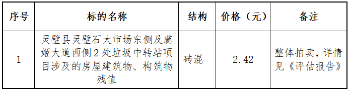 1、拍卖标的:灵璧县灵璧石大市场东侧及虞姬大道西侧2处垃圾中转站项目涉及的房屋建筑物、构筑物残值,详见标的清单;