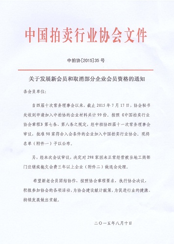 热烈祝贺我公司被选为中国拍卖行业协会会员单位