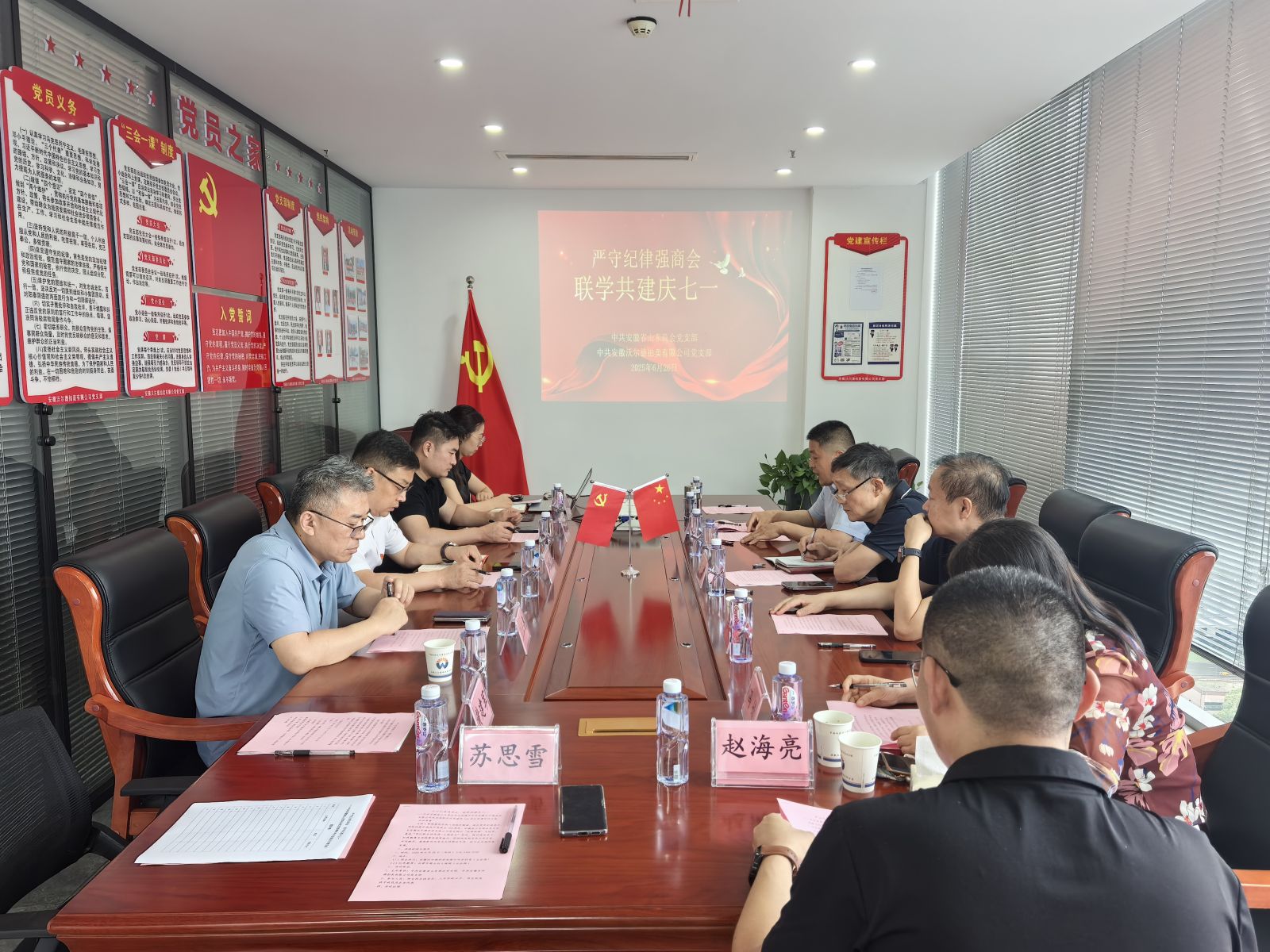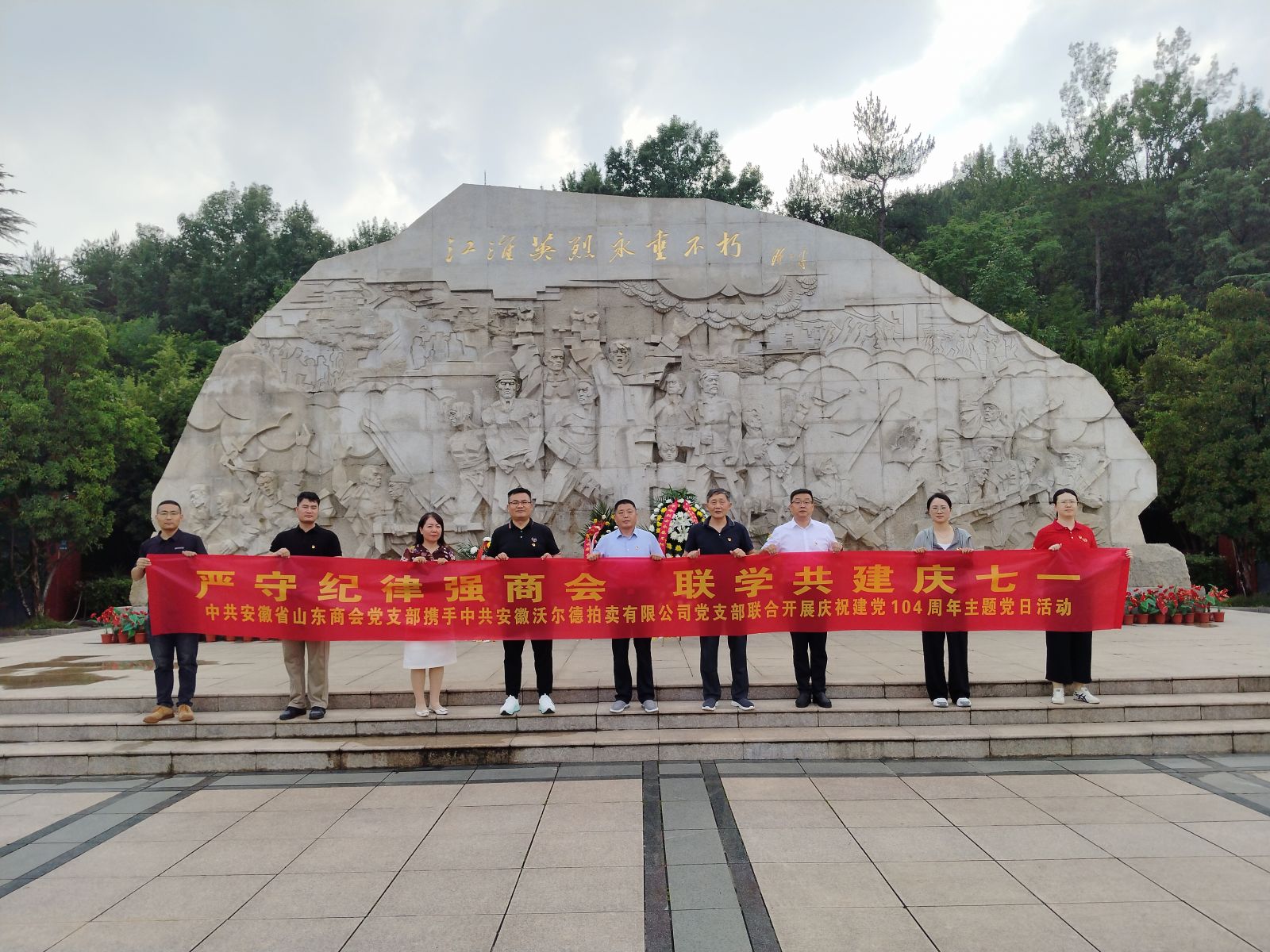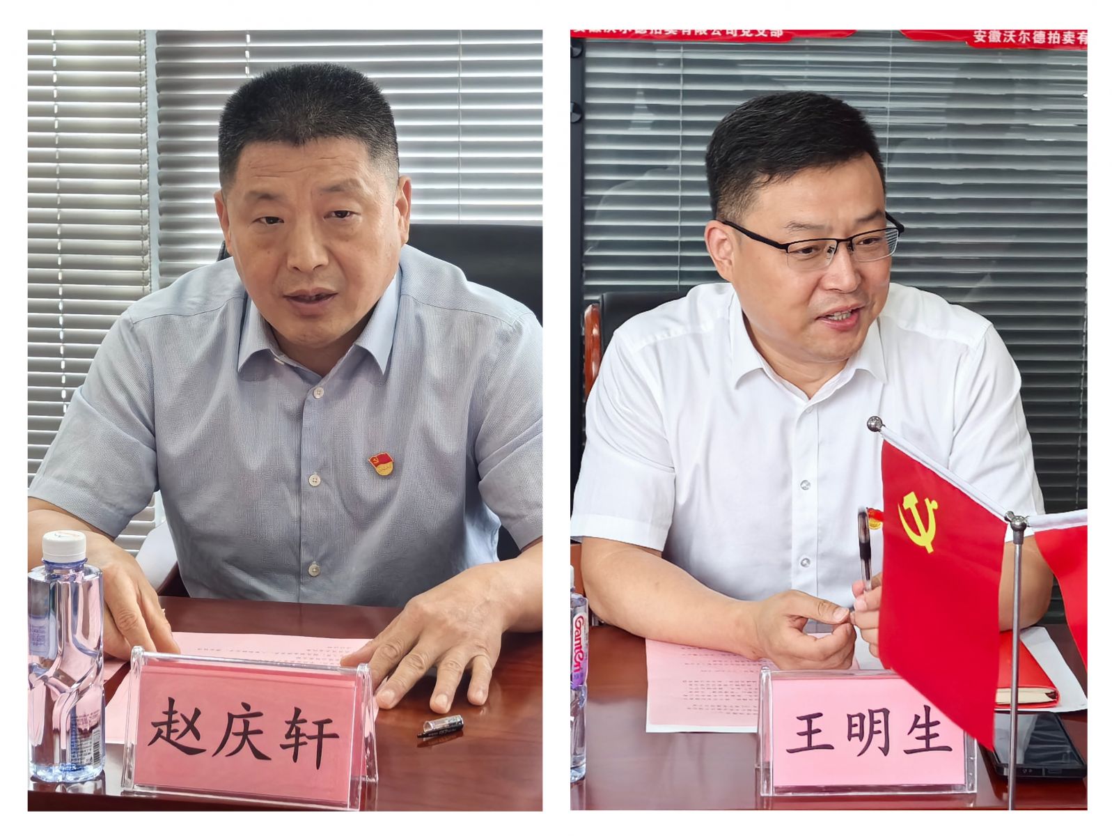 为热烈庆祝中国共产党成立104周年,深入贯彻中央八项规定精神,增强非公党组织的凝聚力和战斗力,2025年6月26日下午,安徽省山东商会党支部与安徽沃尔德拍卖有限公司党支部联合开展“严守纪律强商会·联学共建庆七一”主题党日活动。安徽省山东商会驻会党建指导员、原安徽省司法厅二级巡视员施友树,安徽省山东商会党支部书记、执行秘书长赵庆轩,商会入党积极分子陈晓东(商会监事长)、王正鲁(商会常务副会长)、常务副会长张广森,副秘书长黄建军,商会副会长、安徽沃尔德拍卖有限公司党支部书记、总经理王明生,以及安徽沃尔德拍卖有限公司党支部成员、入党积极分子,安徽省山东商会办公室主任冯婧、会员部部长苏思雪、信息部部长赵海亮等参加活动。