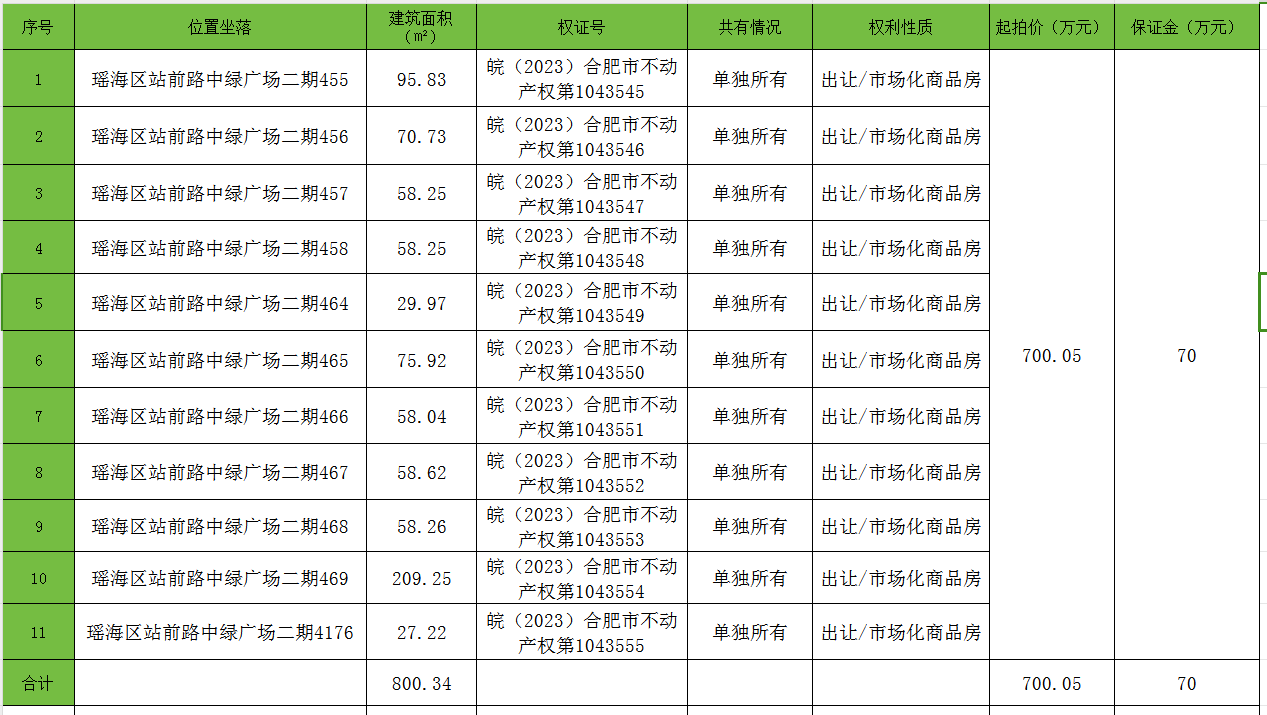 受委托,我公司于近期公开拍卖合肥市中绿广场二期商业房产11套(按现状整体拍卖),标的产权清晰,资产详情如下: