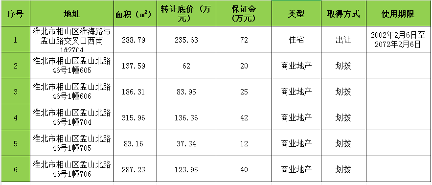 一、标的概况:淮北市相山区6套住宅、商业房产,标的权属清晰,详情如下: